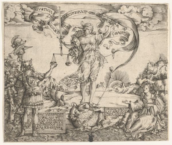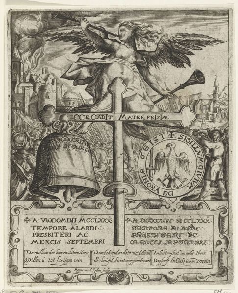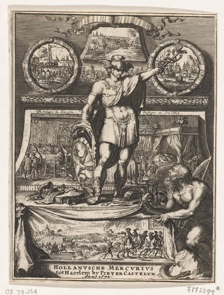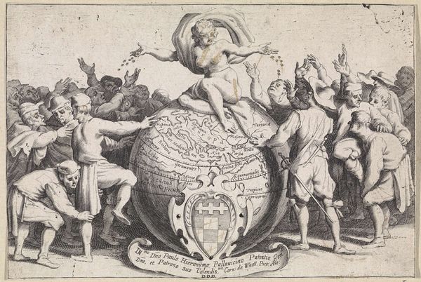 Editor: So, this is *Jupiter en een oorlogsschip met het wapen van Alessandro Farnese*, or Jupiter and a warship with the coat of arms of Alessandro Farnese. It's an engraving by Johann Sadeler I, created in 1585. There is an intense feeling in this, and the dense details pack a lot of information onto the page. What's your take on this? Curator: It is quite striking! Consider this as a piece of propaganda. Alessandro Farnese was a key figure in the Spanish Netherlands during a period of intense religious and political conflict. How do you read Jupiter’s role, perched above it all? Editor: He seems to represent authority, almost like divine justification, right? Considering the warships and weapons below, does Jupiter’s presence sanctify Farnese's military actions? Curator: Precisely. And observe how the zodiac symbols intertwine with the coat of arms and military imagery. It speaks to the supposed cosmic alignment with Farnese’s rule, projecting an image of destiny. It also draws on Baroque style's love of pomp and grandeur. Do you see a relationship to today’s political rhetoric? Editor: Definitely! It is still happening. Framing actions as not just politically expedient, but inevitable, or even divinely ordained, it connects deeply with current discussions of power. This wasn't just art, it was a strategic communication. Thank you, it reframes the piece. Curator: Indeed. Art as a powerful instrument. Understanding that history empowers us to critically assess contemporary narratives.