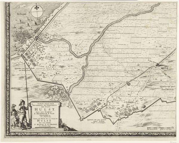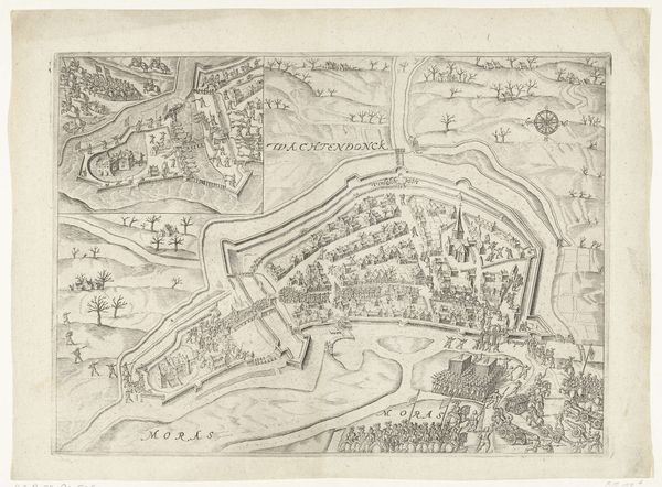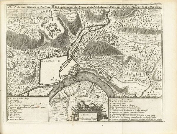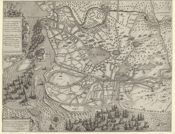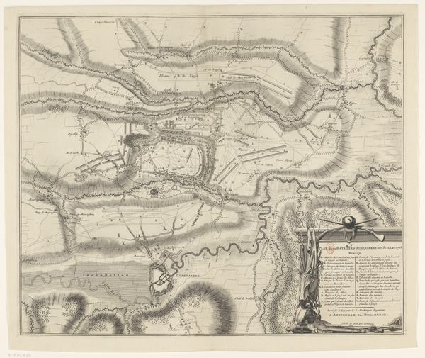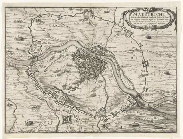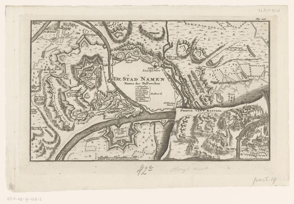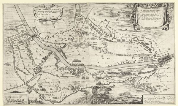 Curator: Before us we have a detailed cartographic depiction, "Kaart van de stad Namen met het kasteel, belegerd door het Franse leger, 1692"– or, Map of the city of Namur with the castle, besieged by the French army. It was created anonymously, and resides here at the Rijksmuseum. Editor: My first impression is one of intense detail, meticulously rendered. The somber monochromatic ink on paper emphasizes precision and functionality; it feels like a blueprint more than an artwork in the traditional sense. Curator: Precisely. Note the elaborate fortifications and strategic deployment of troops around the city. The Baroque aesthetic, so evident in the flourishes of the cartouche, still yields to the need for clear, pragmatic communication above all else. It shows us the structures. Editor: Structures built to destroy, though! It's easy to focus on the visual artistry, but consider the sheer human labor that went into building those ramparts and digging those trenches, not to mention the impact of warfare on those doing the work. The production is deeply entwined with war. Curator: True, war, as a catalyst, has often dictated resource allocation and innovation. Here, the precise linework delineates not only the natural landscape but also the infrastructure of conflict, mirroring the era's shift towards rational planning and systematized violence. Editor: But the means of conveying information itself becomes a powerful tool. By showcasing this battle, are we memorializing the labor and conflict? Or glorifying a very uneven distribution of power? Curator: Perhaps both. It’s interesting how the lines not only depict form but also signify social and political structures, reflecting how cartography, even at its most ostensibly objective, reinforces certain perspectives. The city appears almost as a diagram, each district demarcated by clear boundaries and designated for specific functions, embodying the order of a planned state. Editor: That tension – between functionality, artistic skill, and social critique is, I think, what makes this anonymous piece so enduring. Curator: Indeed, a cartographic lens through which we might examine not just space, but power. Editor: A telling relic of production! Thank you for illuminating this piece for me.