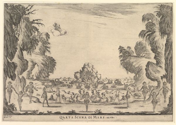 Editor: This engraving, "Grotto scene with Vulcan, from 'The marriage of the gods'" created in 1637 by Stefano della Bella, is incredibly detailed! I’m struck by the sheer number of figures and the fantastical landscape. What story do you think this image is trying to tell, especially with the figure of Vulcan present? Curator: The Grotto indeed serves as more than just a location. It's a threshold. Della Bella captures a layered reality, using the figure of Vulcan—a symbol of creation and destruction, fire and forge—to root us in a narrative that speaks of transformation. Notice how the figures, caught mid-action, suggest ritual, performance, and perhaps even the forging of alliances, literal and symbolic. Consider, what cultural narratives were alive then, where spectacle served political and social functions? Editor: The figures almost appear as if they're part of a ballet or theatrical performance. It definitely feels staged rather than like an actual event. The grotto, therefore, acts as a proscenium. Curator: Precisely! This is about more than visual documentation; it’s about constructing an ideal, infusing classical mythology with the theater of courtly life. Della Bella draws from a well of iconographic traditions, interweaving them with contemporary sensibilities. What enduring archetypes or power dynamics do you think such representations sought to reinforce, or even subtly challenge? Editor: It feels like it’s solidifying existing societal hierarchies, almost glorifying them within this mythical context, while suggesting that through transformation comes greater societal stability. Curator: Absolutely! In looking deeper into these emblems, in considering both overt symbolism and covert narratives, we begin to perceive the multi-layered messaging art carries—both as historical artifact and lasting reflection of human aspirations and tensions. Editor: It's amazing to consider how symbols carry so much intentional meaning and power. Thank you for shining a light on that for me.