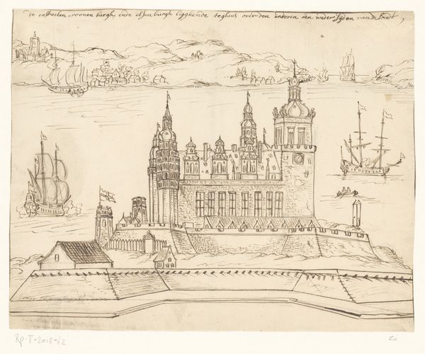 This is Roelant Roghman's "View of Grave," a sepia drawing now held in the Rijksmuseum. The sepia wash creates an atmospheric scene, where the architecture looms over the calm waters. The composition is structured around a contrast between solidity and fluidity, seen in the built forms and their reflection on the water. Roghman uses line and tone to define the architectural elements and their relation to the surrounding landscape. The detailed rendering of the fortifications and town suggests a semiotic engagement with the subject matter, as the architectural components and details serve as signs that refer to the town's historical and social context. The linear perspective and tonal gradations are used to create depth. The artist challenges fixed notions of space by blending detailed depictions with areas of wash. Notice the way the artist's formal choices function aesthetically but also engage with philosophical concerns about representation and reality. Roghman’s work reminds us that art is not a fixed entity, but is subject to ongoing interpretation.