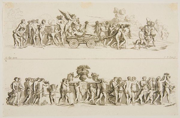 Editor: This is Johann Ulrich Kraus's "Frieze," created around 1700. It's monochrome, and divided into two registers showing different scenes of figures and animals. The composition feels very dynamic and busy. What draws your eye in this work? Curator: The division into registers is crucial. Note how the upper register's frenetic energy, achieved through dynamic figure poses and implied diagonals, contrasts sharply with the lower register's more processional, almost stately, arrangement. Do you perceive how the artist uses line to define form and create movement? Editor: Yes, I see the difference. The lines are much more agitated in the top section. Curator: Precisely. And it’s through this very interplay of line, form, and composition that Kraus constructs meaning. By analyzing these formal elements, we unlock the work’s intrinsic visual language. Editor: That’s so helpful. I'm starting to see how much the composition itself tells the story. Curator: Indeed. Focusing on the inherent qualities allows one to decode how Kraus organizes the relationship of space and figures, thereby revealing its complexity.