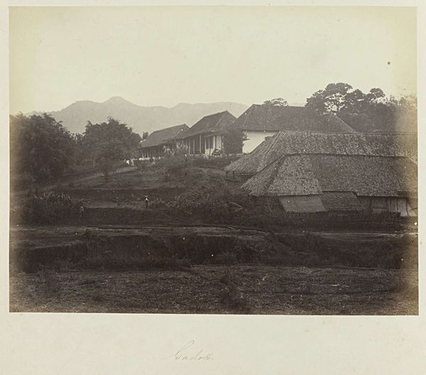 This photograph, "Bron Tissipan bij Gadok," by Woodbury & Page presents a landscape where natural forms meet structured human elements. The composition is carefully arranged, with a building taking center stage, its tiled roof sharply defined against the soft, organic forms of the surrounding trees. The eye is drawn from the geometric precision of the architecture to the dense, almost chaotic, growth of the foliage. This interplay is not just a visual contrast but also a reflection of colonial-era control imposed on the landscape. The varying textures—from the rough tiles to the smooth walls and the tangled leaves—create a rich surface that invites closer inspection. The subdued monochrome palette further emphasizes the structural lines and shapes, highlighting the artificial constructs within the broader natural setting. This photograph prompts us to think about how we impose order on nature and the visual languages we use to represent this interaction.