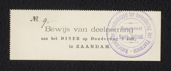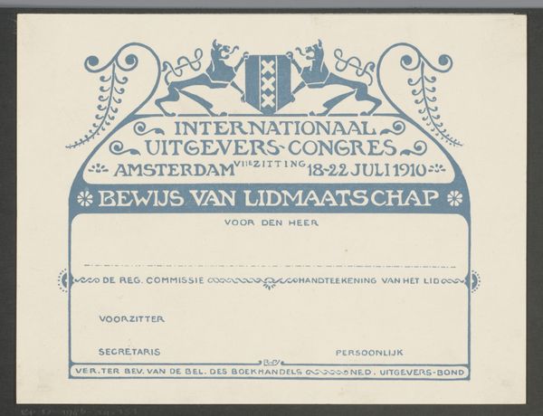 Editor: Here we have “Apothekersetiket voor bessensap,” or Apothecary Label for Berry Juice, from 1931, printed by Steendrukkerij De Jong & Co. It’s a print, almost a poster-like design. I’m struck by how clean and modern it feels, even though it's almost a century old. What draws your eye when you look at this piece? Curator: The visual structure immediately asserts itself. Note the careful arrangement of typographic elements within the rectangular frame. The designer uses the interplay of solid, contrasting blocks of color, and simple shapes – particularly those decorative corner elements – to create visual interest. What do you observe about the font choices? Editor: Well, "Bessensap" is in a bold, sans-serif font that really pops, while the other text is more refined, almost delicate. It creates a hierarchy, I think. Curator: Precisely. Observe how the heavier weight of “Bessensap” anchors the design. The contrasting lighter typeface, along with its strategic placement at the top and bottom, introduces a counterpoint that enhances readability. The graphic elements are clearly deployed to organize space. How would you describe their effect on the whole? Editor: They feel… intentional. Like they're not just decoration, but part of a system, like a visual language. The limited color palette also strikes me. Curator: Yes, a deliberate restriction creates a harmonious whole. Note how the artist adheres to the picture plane; the interplay is two-dimensional and calls attention to surface qualities, consistent with contemporary aesthetics of the era. Consider the impact if more colors had been introduced. Would it achieve the same unity? Editor: I see what you mean. More colors might disrupt the balance and the very streamlined feel of it. Thanks, I wouldn't have considered all these design elements otherwise. Curator: And I appreciate your sharp insights into its immediate appeal, it offers a reminder to appreciate the structure of seemingly simple works.
