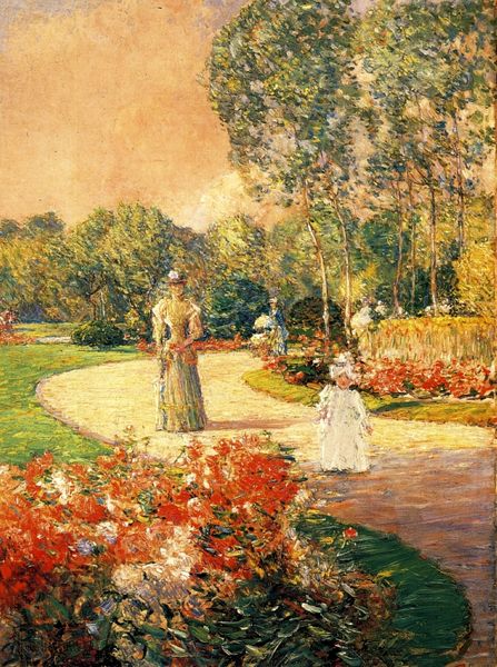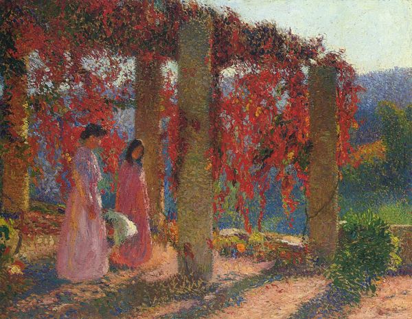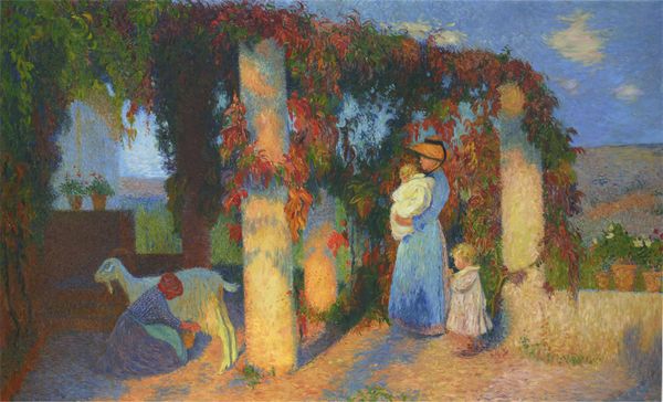 Editor: "Mother and Child in Pergola at Marquayrol" by Henri Martin… It’s just lovely, like a memory shimmering in the sunlight. There is the distinct impressionist brushwork but with that divisionist touch. What social or artistic narratives do you think this piece is speaking to? Curator: I see it as deeply intertwined with the late 19th-century rise of leisure culture and ideas surrounding domesticity. Henri Martin’s choice to depict a mother and her children in a garden suggests a celebration of private life and family values that became increasingly prominent. How does the location - the pergola, and what we can see of the larger setting – inform the narrative, do you think? Editor: Well, it looks like they're situated in a private garden, or perhaps a carefully cultivated natural space. It feels intentionally secluded, almost idyllic…far removed from the social unrest that must have been around at that time. Curator: Exactly! The post-impressionists moved outside Paris and to private spaces to express the social landscape of their artwork. Consider the visual language – the soft brushstrokes and vibrant colors. They are tools here to create a sentimental feeling which certainly spoke to middle-class audiences yearning for stability. Do you notice how the image might participate in shaping cultural ideals of motherhood? Editor: Yes, actually! The mother seems serene and protected, surrounded by nature's beauty, an angel in the house of sorts! It seems like it promotes a very particular kind of safe motherhood narrative. This has me questioning the societal implications and the artistic intention behind the work… Curator: Precisely! That’s how we move beyond mere aesthetic appreciation to a critical understanding of its role in reflecting and shaping its era. Now, seeing how you see it, let's dive deeper…
