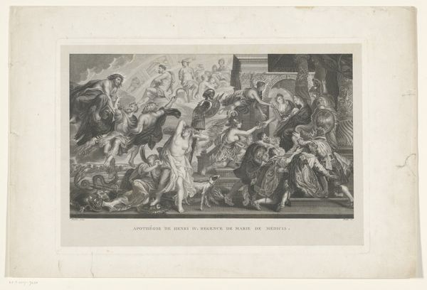 Curator: Right, let's dive in. Here we have Pierre Daret’s engraving, “Geboorte van Christus,” from 1639. It’s currently residing at the Rijksmuseum. Editor: Well, right away, there’s such an amazing quality in this print; I think it is incredibly detailed with its black and white line work that really pops. It does seem slightly staged or overly composed though—do you feel the same? Curator: A little bit, perhaps that's just because it is staged and performed on copper before it makes its way to us here! I mean, look at how the baroque elements inform Daret’s construction of the scene: theatrical lighting, dramatic composition. And how it all comes down to process and the materials that are used to bring the scene to life, not just the message itself. Editor: You’re spot on! It makes you think about how different types of artmaking – something seemingly more immediate like painting versus a meticulous print like this—are consumed differently and thought to signify “high” and “low” culture. Even though it is made from an industrial method that relies so heavily on skill. It gets me thinking... what even constitutes "Art" nowadays? I almost prefer seeing the mark-making of something that feels human rather than technically savvy and flawless! Curator: I see your point. Speaking of which, those cherubic figures hovering above—look how their bodies and the soft drapery play out. Are they actually hovering? Do they feel believable, like flesh-and-blood entities? They certainly aren't "perfect"–aren't we glad that Daret didn't erase that humanness by perfecting his rendering of divine intervention? Editor: Definitely! Though if we pull back, I keep landing on how much Daret relied on a particular social and material structure to produce it; from workshop to patrons. Who was he making it for? What function was it to serve? Did he intend to celebrate religious spectacle, or was it to engage more directly in cultural work by promoting it? So many hands and labor in a piece that celebrates something divine. Curator: Ultimately it seems impossible to fully unpack something so rich. Its message shifts and its power resonates with each viewer through the years; to see the scene through your lens offers me a whole new perspective! Editor: And considering all those decisions and constraints really sharpens my attention to just how much ingenuity is embedded within this very baroque piece! It almost redeems the baroque for me... almost.