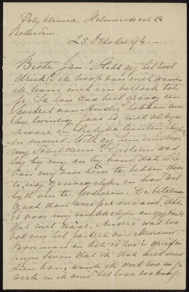 Curator: Charles Howard Hodges, a name I confess I didn't know intimately before seeing this curious thing – “Brief aan professor Göller,” or “Letter to Professor Göller,” penned sometime around 1834 or 1835, a pen and watercolor drawing on paper. My immediate sense? Restlessness. Editor: Definitely restlessness. You get that in the hurried hand, the close writing; it makes me think about who had the luxury of taking their time, writing things over nicely, and who didn't. Was Hodges stressed about the message, about Göller's response, or perhaps struggling to make ends meet and churning things out quickly? Curator: Precisely! The Romantic period gets painted as this floaty dream, but that neglects how it was lived for many. Reading some lines – "Harold" is returned again…a little metamorphosed," or something to that effect. "The other original effusions–it will be published by subscription." Is this Hodges hustling to get something off the ground, leaning on old connections? Editor: That tension between high ideals and quotidian grind is totally visible here. He's writing to a professor, after all; it's a power dynamic at play. And publishing by subscription tells a story about precarity. Before widespread publishing infrastructures, writers were reliant on these networks of patronage. We can also reflect on which voices were included in that artistic conversation and which were excluded due to their location within the social hierarchy. Curator: It is beautiful penmanship, though. See how the weight of the ink changes, those delicate serifs…He cares about the craft, even if he's in a rush. Even in these circumstances, the style reveals how connected he feels to some of his idols, but the means necessary to participate in art creation is dependent on more than drive. Editor: It reminds me that even seemingly straightforward historical documents are always layered performances. Each mark carries the weight of those complex circumstances. I now wonder, in what ways does it speak to issues we face today around fair access to art making and exhibition? Curator: A brilliant question. And looking closer… it does. What an intricate thing, all folded into a single page, it shows, just as anything written now does, a lot about human behavior at a given time.