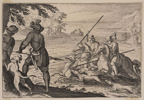 Editor: Here we have "Soldaat bespot door narren," or "Soldier Mocked by Fools," a print dating sometime between 1615 and 1709 by Nicolaes Lastman. It’s done as an engraving and is dominated by these caricatured figures surrounding what I presume is the soldier. I'm immediately struck by how unsettling the scene feels. What do you make of this scene? Curator: Well, it seems like we’re peering into a carnival mirror reflecting human folly. Lastman, though working in the Dutch Golden Age, also plays with Baroque sensibilities, highlighting drama through exaggeration. Do you see how each figure, with their elongated features and distorted expressions, seems to embody a particular type of foolishness? Their gestures are all amplified, bordering on the grotesque. It's like he’s asking us: Who is truly the fool here? Editor: So it’s almost a question of perspective? Like, the soldier may appear foolish in this context, but... Curator: Exactly! The text above, “Mundus vult decipi” - "The world wants to be deceived" - could suggest that everyone here plays a part in some form of deception. The ‘fools’ may just be showing the soldier and, maybe us too, a truth about vanity. Maybe we willingly play the fool to avoid harsher realities? Do you find yourself siding with anyone here? Editor: Not really. The soldier certainly doesn’t appear heroic, and the others… their grins are too wide. They make me uncomfortable! It almost seems to say something bleak about human nature. Curator: Perhaps Lastman's work pushes us to acknowledge those uncomfortable aspects, encouraging reflection on where we ourselves fall on the spectrum of foolery. The fact we are discussing it now shows the artwork really succeeded in triggering that reflection. Editor: It's definitely given me a lot to think about, and maybe to question who gets the last laugh.