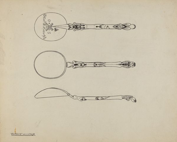 Kalamian Walton's "Silver Demi-tasse Spoon" is a study in the pure form, line, and structure of a common object. Rendered in what appears to be ink on paper, three spoons are arranged in a serial composition. Each spoon offers a different perspective, from above, straight on, and a profile view, giving a comprehensive understanding of its shape. The use of line is precise and economical, defining the object with minimal detail and emphasizing its contours. This methodology invites us to consider the underlying architecture of utilitarian design, transforming the everyday into an object of aesthetic contemplation. Walton seems to be playing with the notion of representation itself. By isolating the spoon and presenting it in multiple views, the artist encourages a semiotic reading of form and function. In this way, the artwork challenges fixed meanings, positioning the object as a signifier within a broader system of visual communication. This creates a space for ongoing interpretation, highlighting the dialogue between art, design, and perception.