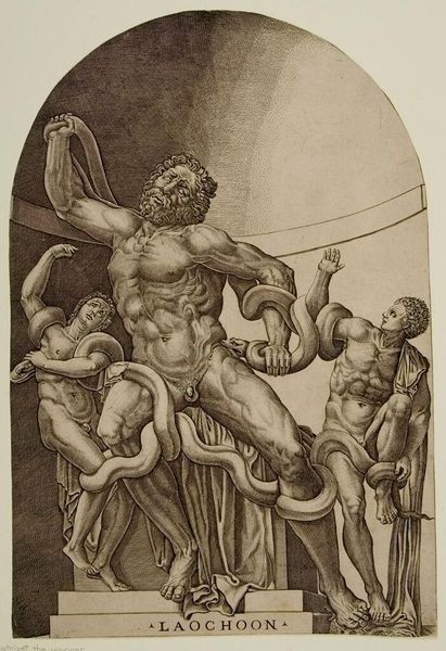 Curator: This is a drawing by Benjamin West, titled "Thetis Bringing the Armor to Achilles." It’s rendered in graphite, focusing on the figures of the nymph Thetis, her son Achilles, and a third figure, likely Patroclus, laying prone. Editor: Immediately, the stark contrast strikes me. The dark armor, the grief-stricken expression of Achilles. It’s heavy with the weight of impending fate. The scale emphasizes Achilles' musculature and powerful physique, the stark rendering almost emphasizes that Achilles is a war machine on the verge of deployment. Curator: Absolutely. Consider West's academic training, we can imagine the hours spent mastering anatomical drawing. This highly detailed graphite work displays a studied understanding of form and the capacity to emulate classical sculpture. The choice of graphite, a readily available and relatively inexpensive material, positions this artwork not as an end in itself, but potentially a preparatory study. Editor: True. And within the mythological context, consider the deeper resonance of the symbols: the armor forged by Hephaestus represents not just protection but divine intervention and an almost pre-determined path. It’s a symbol of Achilles’ destiny and subsequent doom—but one that offers victory through warfare and absolute glory. The image explores universal themes of loss, duty, and the burdens of heroism. Curator: Good points, all. Looking at the composition further supports your interpretations. The arrangement draws your eyes across, first drawn to the body of Patroclus then slowly climbing upward along the shin guard toward Thetis and finally resting on the face of Achilles. Its visual story relies heavily on symbolic knowledge embedded in our relationship to the figures presented to invoke emotions about war and mourning. The use of readily accessible materials makes one think of its purpose, where it can be accessible as part of larger academic processes. Editor: In a way, it reminds us how powerful a simple medium like graphite can be in conveying complex narratives and deeply human emotions—or, more precisely, half-human. Curator: A wonderful thought to conclude our encounter with this evocative rendering of divine intervention and the material weight of war. Editor: Indeed. A powerful convergence of symbol and craft.