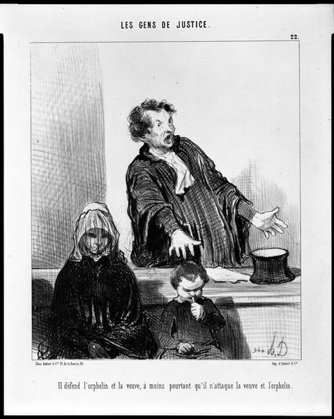 Editor: So, this is "Pleaders" by an imitator of Honoré Daumier. It's a somber piece, with these two figures huddled together. The monochrome palette adds to the seriousness. What do you see in it? Curator: Well, for me, it's a window into a world of legal maneuvering, whispered secrets, and perhaps, a hint of moral ambiguity. There's something theatrical in the way they lean in, don't you think? Editor: Definitely. It feels like a stage. I initially perceived the black and white palette as somber, but I see how the interplay of light and shadow injects some drama. Curator: Precisely! It's that tension between light and shadow, good and bad, that truly captivates. I like your seeing the drama. Editor: This was fun. I'll look at monochrome works differently now. Curator: Me too!