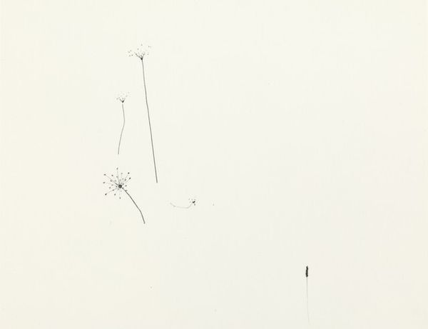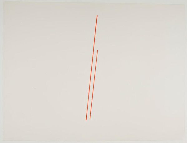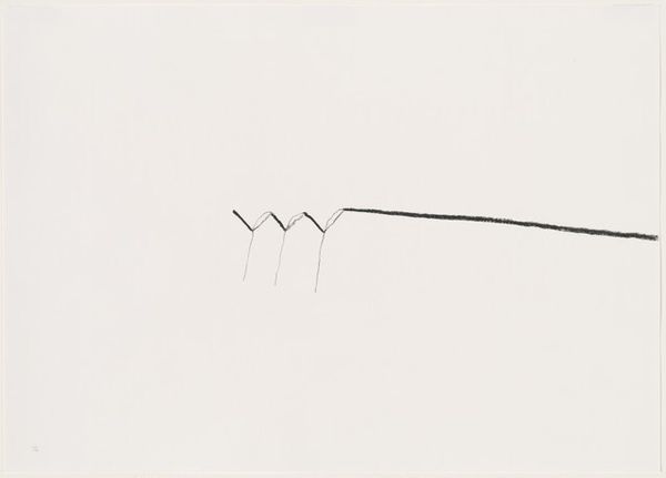 Jan Groth made this untitled drawing with crayon on paper. A solitary black line struggles to emerge from the muted whiteness, evoking a sense of stark simplicity. Groth's work epitomizes minimalist abstraction, reducing form to its most elemental state. Look closely at how the line isn't uniform; it varies in thickness and intensity, suggesting both fragility and strength. The composition is deceptively simple, yet it invites contemplation on the nature of line itself – its capacity to define space and evoke emotion. The tension between the dark line and the expansive white space creates a visual dichotomy, almost a dialectic, between presence and absence, form and void. Consider how Groth, through this reduction, challenges our expectations of drawing. He questions the very essence of representation. The line becomes not just a mark, but a signifier of something beyond itself, a potential symbol waiting for our interpretation. Ultimately, Groth's drawing functions as a powerful meditation on the fundamental elements of art and the evocative potential inherent within simplicity.