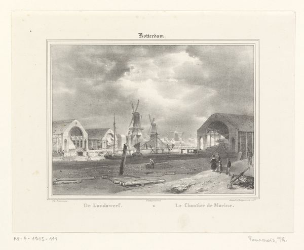 Editor: We are looking at "Koepoort te Delft," an etching by Carel Christiaan Antony Last, dating from around 1841 to 1847. I’m immediately drawn to the play of light on the water and the architectural detail. What do you see in this print? Curator: Indeed, observe how the artist masterfully employs line and tone to construct depth and texture. The composition is carefully balanced. The dark, solid forms on the left, lead our eye across the water to the lighter bridge on the right. The etching medium itself contributes to the nuanced gradations. Editor: The detail is incredible, especially in the architectural elements. It almost feels photographic. What's the effect of limiting the value and saturation so much? Curator: Precisely, note the artist’s acute understanding of form and perspective, devoid of any explicit narratives or symbolism. Consider also the lack of strong tonal contrasts. By muting those aspects, the artist directs our attention to the subtleties within the scene. Are there implied diagonals that organize space in the foreground versus the background? Editor: I do notice some diagonal shapes near the bank of the waterway... I can also see how the darker shapes contrast more against the flat-appearing horizon in the background... it creates separation and draws your eye to the scene. So, it's about pure observation and a meticulous rendering of reality, not necessarily storytelling or making an explicit statement. Curator: In part. I ask you, how do these elements affect your interpretation of the visual image? Consider this: the power is less in ‘what’ is depicted, but rather ‘how’ it is depicted. What does it say? Editor: That makes sense. It's made me think more deeply about composition and how line and form can create a sense of depth, even without vibrant colors. Curator: Absolutely. An excellent demonstration of realism stripped down to its fundamental elements!