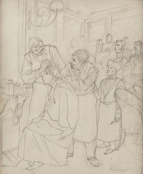 Wilhelm Marstrand made this drawing, "Søstrenes påklædning til karnevallet," with pencil, pen and wash on paper. The composition is dominated by a flurry of activity centered around the women preparing for the carnival. The figures, rendered in delicate strokes and washes, seem to emerge from the light background, creating a sense of dynamic movement. Marstrand employs line and shadow to define the forms. The scene suggests a world of fleeting moments and shifting identities. The carnival, as a space of spectacle, allows for the disruption of social norms and hierarchies. This is reflected in the visual structure of the drawing. The drawing presents us with a world of dressing up and role-play where identities are not fixed but are open to reinterpretation. The sketch-like quality further reinforces the idea of a transient moment, capturing the very act of transformation and preparation. This artwork destabilizes established meanings and categories by presenting a fluid and transformative scene.