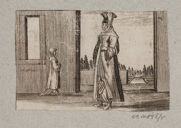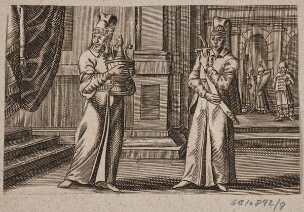 Curator: Look at this intriguing engraving from the 17th century. It's called "A Falconer and a Turkish Servant in a Doorway. In the background a Knight Tournament". It’s by an anonymous artist and resides in the Statens Museum for Kunst. Editor: My initial reaction is of staged grandeur, almost like a play within a print. The two figures in the foreground command attention, yet the tournament happening behind them pulsates with far more life and immediacy. It seems strangely dissonant. Curator: Precisely. Note the careful use of line and composition to establish this division. The foreground is all strict verticality and contained shapes in the robes, with clear definition outlining each form and separating them distinctly, framing, essentially, the dynamic scene in the background. Editor: I am curious about the materials and labour required to produce such an image during that time. What sociopolitical implications do we glean when reproducing this image using metal and ink, with multiple impressions created from a single etched plate? Is this meant for mass distribution or commissioned as decor for a patron of wealth? Curator: Well, the scale alone, indicative of printmaking traditions during this era, offers intriguing access to Baroque art as a mode of storytelling—disseminated more democratically beyond painting and other traditionally prioritized art forms for wealthy benefactors. The very act of depicting a tournament speaks volumes about desired ideals. Editor: And to couple that narrative with, notably, two individuals from differing class or social strata within a domestic setting. In whose dwelling is the tournament transpiring? What purposes did prints such as this provide? Curator: Indeed. Perhaps this artwork seeks to underscore the relationship of social stratifications against scenes of grandiose tournaments? Consider the meticulous execution of engraving that highlights specific aspects of power relationships in society during the Baroque period. It's as though the artist utilizes spatial arrangements to communicate status in society. Editor: Right. I look beyond the immediate portrayal into the methods of its making, its means of reproduction and accessibility during this particular period of societal construct. Curator: In that, you also discover how the artistic arrangement informs the thematic tensions prevalent throughout its construction, its visual cues revealing hierarchical significance. It invites contemplation, even to this very day. Editor: Precisely. The material tells of something far more telling than the immediate aesthetic experience provides. The historical construction matters to understanding even its visual impact.