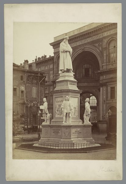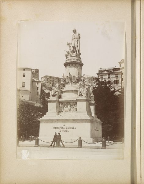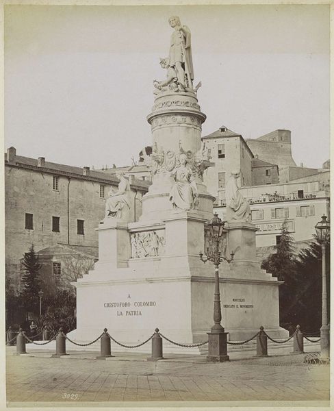 This photograph by Fratelli Alinari depicts the statue of Christopher Columbus in Genoa. The image offers insight into the cultural and political values of the late 19th century. Columbus, the famous explorer, stands atop an elaborate monument, his gaze directed towards the horizon. The statue is adorned with allegorical figures and reliefs, visually encoding the narrative of discovery and progress. Made in Italy, this image reflects the rise of nationalism and colonialism during this period. The statue functions as a symbol of national pride and European expansionism. The monument was built at a time when Italy sought to assert its place on the world stage, in relation to other European Empires. Looking closer, we might ask, for whom was this statue built? What did it mean to the local population? An art historian might consult archives, newspapers, and other period documents, in order to fully understand the monument's complicated cultural meaning.