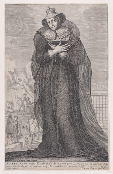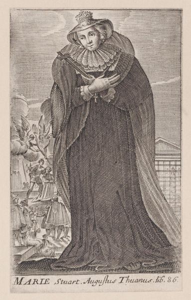Editor: Here we have "Copy of La Dame Coiffée d'un Grand Voile et a la Robe Bordée de Fourrures," an engraving likely dating from the 17th century, currently housed at the Met. What strikes me immediately is the way this noblewoman dominates the print. It feels like a commentary on status. What do you see in this work? Curator: The dominance of the figure is fascinating, isn’t it? Consider the context. This was a time of rigid social hierarchies. Prints like these, circulating amongst a growing middle class, were powerful tools for both disseminating and critiquing those hierarchies. The scale of the woman compared to the village scene becomes symbolic. Do you think it’s a straightforward celebration of nobility, or is something more complex at play? Editor: That’s a great question. I see your point about the middle class consuming these images. It almost feels satirical to me. The exaggerated size and elaborate clothing read as almost comical, a way of gently poking fun at the elite, while ostensibly portraying them. Curator: Exactly! And notice the subtle details, like the seemingly endless train of her gown flowing into the town's edge, almost encroaching upon it. Think about the role of fur at the time. It's not just about fashion. These prints often codified status. Could it be argued this engraving captures an ambiguous stance reflecting contemporary public sentiment toward the aristocracy? Editor: That’s insightful. I hadn't thought of the dress and fur as symbols of aristocratic excess *encroaching* upon the common folk. That perspective completely alters my understanding. Curator: And that's the power of viewing art through its historical and social context. Editor: Thanks! I'll definitely remember to consider audience and distribution moving forward.