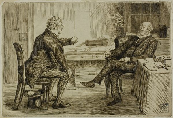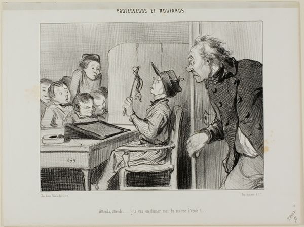 Curator: Here we have an early lithograph by Honoré Daumier, a French artist renowned for his satirical commentary on 19th-century French society. It's called "Moi, j'ai habitude de ne... rien donner," or roughly, "I am accustomed to never... give anything." Editor: Oh, it has that instantly recognizable Daumier gloom, that dark Parisian atmosphere. It feels so weighty, like all the city's problems are swirling right there at that little café table. The line work looks really frenetic. Curator: Exactly. Daumier masterfully uses the lithographic crayon to create dense, almost oppressive shadows. Look at the haggard faces. There's a critique of social miserliness lurking here, would you agree? It connects to broader concerns about poverty, inequality... Editor: Miserliness...that feels like a kind word, haha. This piece is pure cynicism! "Encouraging celibacy," indeed. More like encouraging a whole lot of grim faces and bad coffee. It speaks to that particularly ugly strain of human behavior: justifying cruelty with a veneer of moral high ground. And the way he renders those expressions… almost animalistic! Curator: I'd say the Romanticist style contributes to that intensity as well. Look how exaggerated the features are—it verges on caricature. Daumier really pushes the emotional and psychological impact through visual exaggeration. But note that there is also line work in here. It must have been applied with a pen. Editor: Right, because the image wouldn't hit so hard if he was too slick. Also the way that guy drinking something or other has an expression like he's on his fifth day of it. Curator: This piece is part of a series, you know, "Les Habitués des Cafés"—"Café regulars". So it's tapping into recognizable social types, recurring behaviors… it's a study of these figures as they populate Paris's coffee houses. Editor: And a reminder that some human patterns, sadly, repeat throughout history. Though I like to imagine it might be different today, it always reminds me of someone at my old writing place in Paris with their coffee. You either gave tips to a bunch of grumpy faces or lived with an uncomfortable weight. Curator: I agree that it captures something timeless. It’s really a profound blend of realism and emotionally charged commentary, wouldn't you say? Editor: A grim reminder, as potent now as then. Maybe more coffee's in order for both of us now...