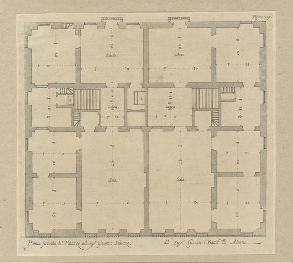Curator: Here we have Jan Matthysz.’s 1655 print, titled "Plattegrond van Paleis Huis ten Bosch en het omliggende landgoed," an etching showing the layout of the Huis ten Bosch Palace and its gardens. Editor: At first glance, it evokes a sense of structured formality and almost sterile precision. The strict geometric organization gives it an intellectual rather than emotional presence, as if intended to showcase control and order above all else. Curator: Precisely. The piece illustrates not only architectural design but also power dynamics, the relationship between humans and nature, and the broader socio-political context of 17th-century Dutch aristocracy. The Baroque style emphasized grandeur and order, reflecting the Dutch Republic's aspirations. Editor: Thinking of recurring motifs, the squares, rectangles, and the axial symmetry—these are archetypal symbols of stability and balance. The careful arrangements within the garden spaces almost appear like coded messages, mirroring a kind of societal blueprint with meticulously laid pathways indicating direction, perhaps a demonstration of intent, and an illustration of power and legacy. Curator: Definitely, particularly when viewed through the lens of contemporary theory, Huis ten Bosch palace symbolizes not only spatial planning but also the construction of identity. The palace, originally built by Amalia von Solms, became deeply intertwined with the representation of her power as a woman in a patriarchal society. Editor: Moreover, consider how landscapes can reflect human ideas onto nature, expressing desired virtues through structured garden features. These symbols gain deeper layers through association with history and mythology, serving as emblems within a collective memory. Curator: This reminds us that even something as seemingly objective as an architectural blueprint has inherent social and political implications that warrant further examination through cultural lenses. Editor: Agreed, and by recognizing the rich symbolic nature inherent to such detailed renderings, we've been given a deeper understanding of both cultural ideals and material culture in Jan Matthysz.’s image.