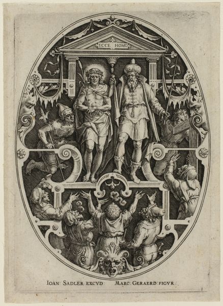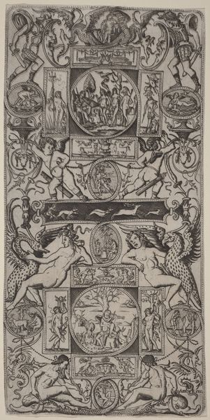 Editor: We’re looking at Agostino Veneziano’s "Ornamental Panel," made sometime between 1514 and 1536. It’s an engraving, so primarily lines, and there’s a lot going on with figures and fantastical creatures. It strikes me as almost a study in contrasting textures. What catches your eye? Curator: The meticulousness of the engraved line is paramount. Notice how Veneziano varies the line weight to suggest depth and shadow. Observe, too, how this linear system generates a field of tensions across the pictorial space. Semiotically, the panel oscillates between sacred and profane registers. What readings can be extrapolated from its structure? Editor: Sacred and profane? I see putti and what look like maybe Artemis in the middle, but I also see griffins and snakes... How does it balance? Curator: Balance, perhaps, is not the primary objective. The piece foregrounds visual and conceptual discordance. Consider the structural oppositions: idealized central figure versus the chaotic ornamentation. What statement does the artwork generate when analyzed as an act of differentiation and articulation, a structured declaration? Editor: So, it’s not about harmony, but about the tension between the different elements and what *that* says? I hadn't thought about it that way. Curator: Precisely. By resisting simplistic readings and embracing complexity, Veneziano creates an intellectually stimulating visual field for its Renaissance audience. He generates a visual discourse and calls the audience to engage with its inherent dichotomies. What meaning surfaces when examining the artwork's linguistic aspects? Editor: That's given me a totally different framework to consider the whole image and period in general! Curator: It is my sincere hope that our dialogue offers insight into a new reading. The panel exemplifies how rigorous analysis enables access to new understandings, even now.