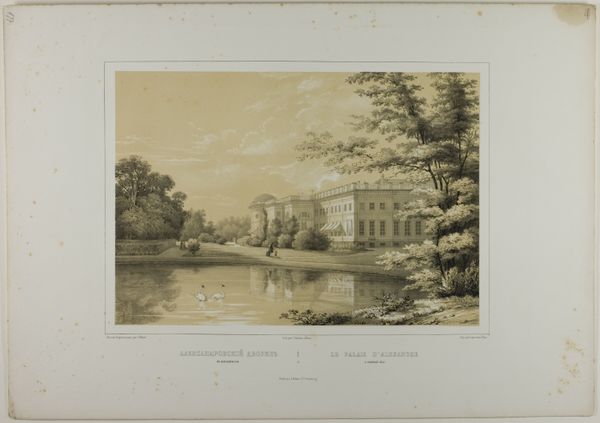 Curator: This print captures Hampton Court Palace, near London, sometime between 1841 and 1885, though its creator remains anonymous. What’s your first take on it? Editor: It feels both grand and oddly delicate, doesn't it? Like a dreamscape version of an imposing palace, all rendered in shades of gray. The figures almost seem to float in the foreground. Curator: Absolutely. Engravings, like this one, held a crucial position in the dissemination of visual information. They shaped the public’s perception, acting as almost a form of visual journalism, wouldn’t you agree? This allowed a wider audience access to famous structures and landmarks. Editor: Definitely. But beyond pure information, it subtly promotes specific social ideals. The palace becomes a stage for portraying fashionable leisure. Observe the attire and social interactions – it reinforces an image of refinement and status, very performative, isn’t it? Curator: The symbolic weight is significant, echoing earlier depictions of idealized courtly life. You see baroque influences mingling with neoclassical architectural styles – all projecting a vision of power anchored in tradition. Do the costumes speak to you of any symbolism? Editor: Well, look at the women's dresses. They’re not just fashionable; they convey status, domesticity, and a certain moral standing. The children at play suggest innocence and continuity. It’s all carefully staged to communicate distinct cultural values. Even the framing of the building implies solidity and endurance. Curator: And how do you see this piece fitting within art of its time? Is it unique, or part of a tradition? Editor: I think it serves as a potent artifact illustrating the politics of image-making. This piece highlights what parts of the historical narrative got emphasis and which parts got less notice in those times, which affects how it is perceived still. Curator: It also invites us to consider its audience: who were these images made for, and how did they shape their understanding of British identity and power? A humble engraving with a heavy past to analyze. Editor: Absolutely. It reveals a desire for not just visibility but a kind of curated, approved, public facing visibility—not merely an image but a constructed vision that still shapes perspectives today.
