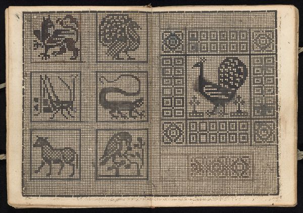 Editor: Lala Eve Rivol's "Petroglyph Design," made between 1935 and 1942, is a fascinating linocut print. The arrangement of these figures in their individual frames almost reminds me of a storyboard. What's your take on it? Curator: The choice of linocut, a readily accessible printmaking technique, speaks to the democratization of art during the period. I see it engaging with the resurgence of interest in Indigenous art forms of the American Southwest during that time, reflecting on how those traditional glyphs might speak to contemporary social and political issues, especially around marginalized communities. Do you notice how the grid emphasizes each glyph as a self-contained narrative? Editor: Definitely, the framing makes me consider each image as its own entity while the composition links them. I was wondering, do you think the choice to emulate petroglyphs is a conscious statement, a reference to a specific culture or time? Curator: Absolutely. The act of "quoting" ancient art serves to connect to ancestral wisdom but, we must be careful not to essentialize or appropriate from these cultures. How can we, as contemporary viewers, responsibly engage with these echoes of the past in the present, knowing Rivol was a white artist working with these images? Editor: It definitely feels like an important consideration is to investigate her background to know how she understood what she was representing. Curator: Exactly. Thinking about the political climate of the time, where did indigenous voices factor? Editor: I suppose, not very much, but in our approach we have the opportunity to rewrite history by bringing forgotten voices. Curator: Yes! We must remain critical, accounting for the power dynamics inherent in representation itself. I’ve certainly learned something new thinking this through with you. Editor: Me too. It highlights how a work like this is less about the images themselves and more about their complex, ongoing relationship with their context and legacy.