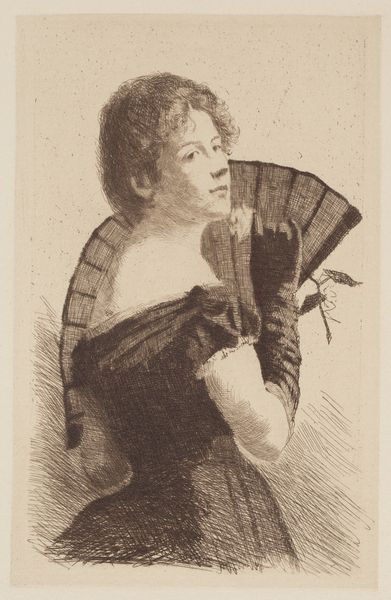 Curator: Looking at this 1868 etching by Edouard Manet, "Exotic Flower," I'm immediately struck by the sitter’s somber expression. Editor: Yes, there is an air of melancholy about it. What grabs me first is how Manet uses the etching process to create such textural variety; the grainy background contrasts beautifully with the smoother surfaces of her face and arms. I find myself focusing on the technical skill behind the work. Curator: Agreed. Etching was a significant medium for Manet, and this piece offers an intimate view of 19th-century Parisian society. One can almost see this work existing as a response to the controlled bourgeois norms. There is a certain defiance to it, almost as if the sitter represents the emerging modern woman, aware of the traditional role assigned to her and perhaps chafing against its constraints. Her downcast gaze hints at something more complex than simple beauty. Editor: Absolutely. Think about the labour involved; the time taken to prepare the plate, etch the image, and then produce the prints. This challenges the notion of the artist as simply a purveyor of high art, pushing the boundaries between the 'fine' and 'applied' arts. Her fashion is an indicator too—lace accents but dark. Her accessories suggest access to luxury. Curator: Exactly! Consider how Manet portrays her; she’s holding both a fan and a flower, objects associated with feminine adornment, yet she doesn't present herself for admiration. It subtly subverts the typical male gaze prevalent at the time. The composition directs us, demands a critical look beyond mere aesthetics. Editor: That makes me consider the distribution of prints like this. Multiple prints suggest a desire to make art more accessible. Who was consuming this kind of artwork and what does that tell us about art democratization back then? Was it challenging the social and financial structure of the arts world? Curator: It's such an introspective moment captured through line and shade. Thanks to your close consideration, it helps draw me closer to it. Editor: And likewise to you, to its human touch! I appreciate how bringing in questions of identity expands my understanding of what to look for in the making.