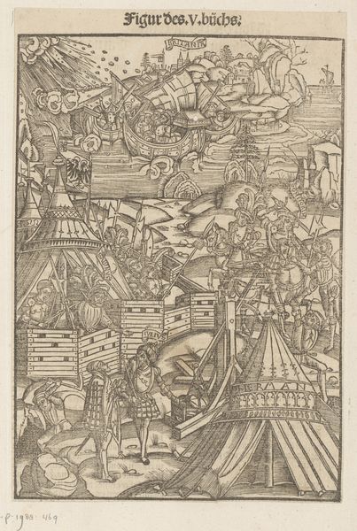 Curator: So dramatic! It looks like two ships in the middle of an intense, somewhat chaotic skirmish. A definite sense of urgency. Editor: Indeed. What we're seeing here is "Twee schepen met soldaten," or "Two Ships with Soldiers," an etching by Abraham Bosse dating back to 1637. It's currently housed in the Rijksmuseum. For me, this piece speaks volumes about power, conflict, and the socio-political landscape of 17th-century Europe. Curator: The figures are fantastic, aren’t they? All suited up in elaborate finery, yet there’s this immediate sense of the brutal nature of sea battles. There's also the angelic figure with the draped cloth that adds to the narrative's grand scope. Editor: Absolutely. And that angel hovering above – probably representing Fame or Victory. Consider who these soldiers might represent, their potential role within larger power structures. Maritime power was definitely key back then, for trade and territorial control. Bosse was actually trying to visualize military campaigns for wider audiences, particularly the aristocracy. Curator: The level of detail is remarkable for such a relatively small work. Every line seems intentional. I especially appreciate the depth that's achieved despite its monochrome palette. What’s striking is how meticulously crafted this small-scale etching manages to convey movement; one can almost hear the crashing of the waves, shouts. Editor: That meticulousness serves a purpose. Engravings such as this helped propagate certain political ideals. It definitely shows a romanticized vision of battle which, divorced from reality, served power. The artist must have understood the potency images hold in manipulating public thought, too. Curator: It does makes one consider perspective - that’s the fun bit, isn't it? What reality are we presented with here and how might that not entirely mirror the soldiers' actual experience? And in which way is war always filtered before we see it? The composition really draws you in – a dizzying feeling, being right in the middle of this conflict! Editor: Indeed, let's think more deeply about whose stories aren't visualized and heard within historical war narratives. A powerful piece on the nature of the military conflicts back in the day and the use of media. Curator: What a wonderfully disquieting experience that was! Editor: Definitely lots to think and feel about!