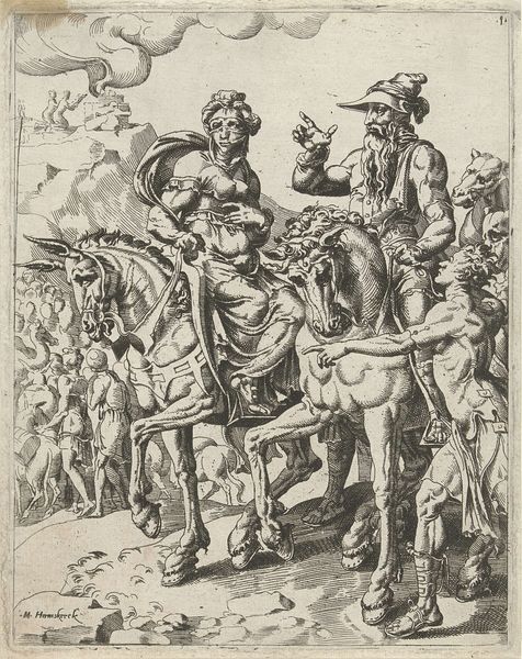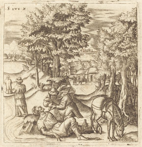This etching by Jacques Granthomme, created in the 17th century, depicts a biblical scene with stark contrasts of light and shadow that sculpt each form with an almost tangible presence. The composition is structured around the diagonal ascent of the Samaritan leading the horse, creating a dynamic movement toward the distant inn. Granthomme masterfully uses line and texture to differentiate the figures and the landscape. The Samaritan and the injured man are rendered with meticulous detail, emphasizing their physical forms and emotional states. The background, filled with buildings and trees, adds depth and complexity to the scene, reinforcing the narrative's context. The overall effect is a carefully constructed interplay of forms, where each element contributes to a larger symbolic order. Granthomme invites us to contemplate the ethical implications of care and compassion, and the subtle power of visual language to communicate complex moral narratives.