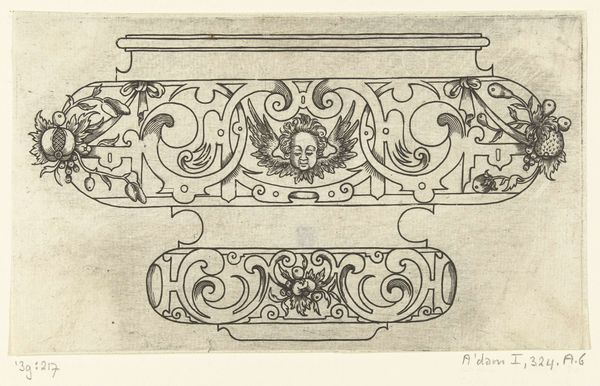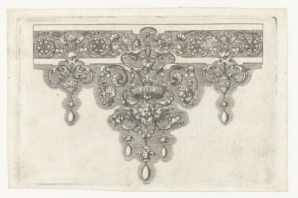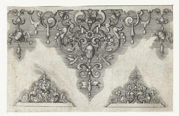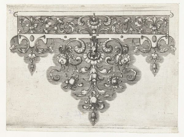 Editor: Here we have an engraving from sometime between 1571 and 1639, titled "Edge with a Frieze Decorated at the Top with Flowers and Foliage," created by an anonymous artist. I’m struck by the density of the pattern; it feels almost overwhelming. What stands out to you? Curator: It’s crucial to consider the materiality and the reproductive technologies at play. This isn't just a drawing, it's an engraving. What was its function, its utility within the early modern social context? Editor: It looks like a decorative border, perhaps intended for printing or some kind of applied art? Curator: Exactly. These engravings were functional objects, templates, essentially. Consider the labor involved: the engraver, the printer, the end user who might apply these designs to furniture or textiles. Think about how this form flattens hierarchies. Editor: What do you mean by hierarchies? Curator: The engraving blurs the boundaries between fine art and craft. Was this engraver considered an artist, or an artisan? The material itself forces us to question how labor is valued, how consumption patterns were taking hold with increasing printed materials, how art could become applied to everyday objects. Does understanding its original intention change the way we view it? Editor: I think so. Thinking about the labor, and its social function really challenges my initial assumptions about its aesthetic value, as something 'precious'. It's amazing to consider it as a template, democratizing art in a way. Curator: Precisely. It shows that artistic expression can be embedded within even the most functional objects. We tend to focus on the 'who' but sometimes fail to focus on the 'how' and 'why.'