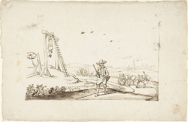 Harmen ter Borch created this pen and brown ink drawing, titled "Groentemarkt, van achteren," around 1651, offering us a glimpse into a 17th-century Dutch marketplace. Ter Borch, born in the Netherlands during its Golden Age, would have been keenly aware of the burgeoning merchant class and the economic vitality of Dutch society. Here, we see figures busily engaged in commerce, their backs turned to us, obscuring their identities. This particular vantage point is interesting; the artist chooses to show us the labor, the transactions, the material of the market, and not the individual faces. Consider the role of women at the market, their presence essential yet often unacknowledged in historical narratives. Ter Borch captures the social dynamics of the marketplace, hinting at the diverse roles individuals played in this bustling hub of economic and social exchange. In its depiction of everyday life, the drawing invites us to reflect on the lives of ordinary people, their labor, and their place in the broader tapestry of Dutch society.