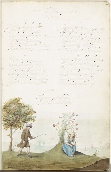 This is a page from Gesina ter Borch’s visual and literary commonplace book, made in the Dutch Republic, sometime in the mid-17th century. It’s ink and watercolor on paper. The most immediate aspect of this page is, of course, the script; its graceful, flowing lines are the result of immense calligraphic skill. Ter Borch carefully controlled the consistency of her ink, the angle of her pen, and the pressure of her hand, all to create this beautiful effect. She obviously had good manual dexterity. But it's the combination of handwriting and image that makes this page special. The watercolor sketch at the bottom is charmingly naïve, and also directly responsive to the poem above. It's a kind of ‘illuminated manuscript’ made personal, and deeply intimate. In this work, Ter Borch is participating in a tradition that valued both writing and drawing as essential social graces. It reminds us that "art" in this period had a much broader definition, encompassing both the literary and the visual.