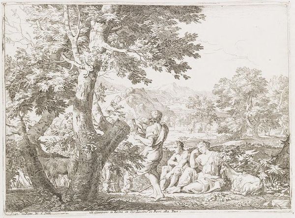 This is ‘Landschap met herders en een hond,’ or Landscape with Shepherds and a Dog, an engraving by an anonymous artist. The process of engraving involves using a tool called a burin to carve lines into a metal plate, which is then inked and printed. The crisp, precise lines you see are a direct result of this technique. The artist would have needed a steady hand and a deep understanding of how to translate tonal values into a series of marks. In this particular print, the way the trees and figures are rendered creates a pastoral scene, a romanticized vision of rural life. But even these seemingly simple images have a connection to broader social themes. The work celebrates the kind of honest labor that was seen as the backbone of society. Considered the time and skill involved in creating an engraving like this, we get a much richer appreciation for the print. It reminds us that what might seem like a simple image is in fact the result of considerable effort and tradition.