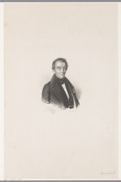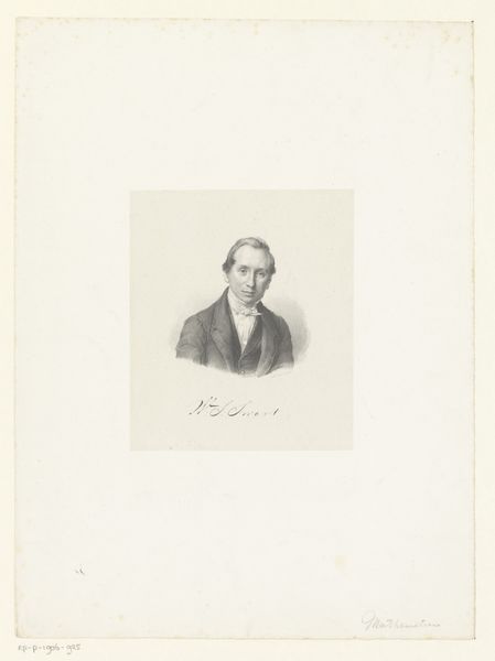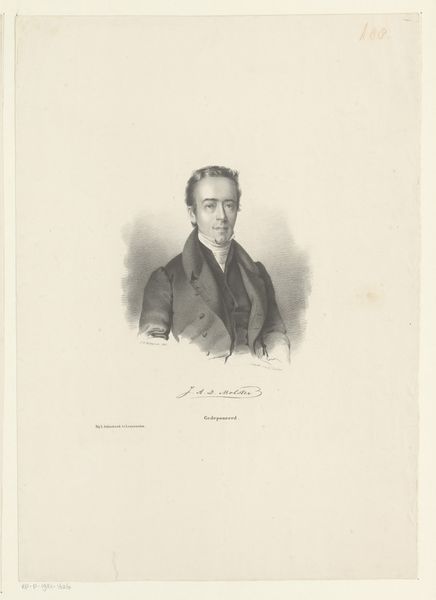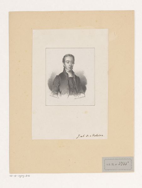This is Pieter Wilhelmus van de Weijer's portrait of Johannes Abraham Dederiks Molster. The lithograph is an exercise in contrasts, contained within an oval shape. The subject’s dark clothing starkly opposes the pale backdrop, creating a formal tension. Here, the artist has rendered the human form through a series of lines and tonal gradations. Note how the rigorous linearity of his coat counters the softer facial features and how the play of light defines Molster's gaze. There is a clear dialogue between the structure and surface, between line and tone. The semiotic result is to suggest a figure of precision, but also someone approachable. Consider how the formal qualities of this work reflect broader cultural ideas. Is it an attempt to represent a person, or to capture something more enduring about the sitter’s social role? The tensions between the linear and the tonal suggest that the art of portraiture sits between capturing detail and something altogether more profound.