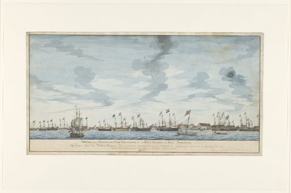 Curator: Robert Charles Dudley created this evocative watercolor and graphite drawing, entitled "The Cable Passed From the Works into the Hulk (the Old Frigate Iris) Lying in the Thames at Greenwich" between 1865 and 1866. It's currently held at the Metropolitan Museum of Art. Editor: My first impression is melancholic. There’s a sense of industrial decline looming, captured in this almost ghostly rendering of a ship and dock. Curator: Indeed. The hulk of the Iris, a former warship now reduced to serving as a cable-laying vessel, is rich in symbolic significance. Consider how ships historically represent journeys and power. This ship, in its decline, signifies the shifting tides of empire, the transition from sail to steam, and perhaps even broader societal anxieties regarding industrialization and obsolescence. Editor: Right, this isn't just about technological advancement. It speaks volumes about Britain’s naval prowess beginning to diminish at the time. You've got the physical decay of the ship mirroring anxieties of losing global dominance. Curator: Absolutely. Dudley seems fascinated by the way objects carry cultural memory, you see it even in the placement of the cable, suggesting a connection to a larger, unseen world beyond the frame. The cable is the literal connecting factor. The ship as a symbol transforms when attached to a cable-- it is connected to the social reality. Editor: That’s an interesting observation about the cable. It is the link to further extraction and perhaps the beginning of international telecommunication. Looking at this composition through a postcolonial lens, the industrial advancements become complicated, because what does this technological shift mean to exploited populations? Curator: That reading makes visible the way seemingly innocuous scenes are imbued with a legacy of control and resource exploitation. The seemingly muted palette serves only to reinforce those underlying emotional themes, adding to the aura of decay you picked up on at first. It prompts a reflection on the costs, both tangible and intangible, associated with "progress". Editor: Looking again, the water itself isn’t serene but almost disturbed. And the lack of vibrant color—almost monochrome —emphasizes the solemnity of the moment. It makes you consider those working in the shadow of progress and who have likely been written out of official historical accounts. Curator: And as an artwork, it’s a potent reminder that even images of industrial progress can carry narratives of loss, transition, and ultimately, cultural transformation. Editor: This makes me think a lot about how artists can invite conversations around social responsibility. What begins as an unassuming sketch ultimately leads to much needed discourse.