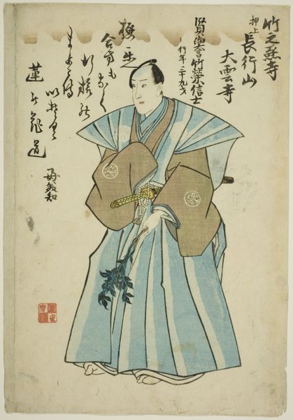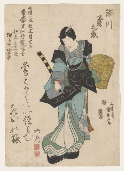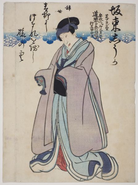 Curator: I'm drawn to the tranquil sadness in this print. Is this the Utagawa Sadafusa portrait of Iwai Hanshirō VI? Likely created around 1836? It has such a contemplative mood. Editor: Yes, indeed. It is. What strikes me immediately are the downcast eyes. In art, we tend to connect averted gazes with a sense of humility, perhaps even mourning, like the ones you mentioned. Here, coupled with the hands folded inward and the delicate kimono… there’s a story of quiet strength being told. Curator: That is precisely what captures my attention—that hint of stoicism woven with vulnerability. In a way, Sadafusa lets the viewer be more familiar with this celebrated kabuki actor, showing him as someone who feels just as intensely as those in the audience. It feels almost scandalous somehow, considering his position. Editor: The kabuki actor, though a cultural icon, then, shares that vulnerability, democratizing the experience through this portrait, making him both divine and human, relatable to a broad audience. Note also how the blossoms and patterns decorating the kimono, signs of spring and beauty, become symbols of transition and perhaps a lament for fleeting life? Curator: Absolutely! The contrast with his somber pose magnifies his feelings of tenderness. And, interestingly enough, look at the column of calligraphy beside the figure. Are they eulogies, or poetry even? Are we invited to interpret Hanshirō's life beyond the persona on stage? Editor: These prints often intertwine visuals with words. This particular piece of calligraphy contributes a kind of memorial inscription to the piece, which is very appropriate considering its function and somber attitude, like whispers of his lasting presence beyond just this representation. The choice of this blue hue must be more than an aesthetic choice too; a lot of meanings can come into play when it is used within a print like this one. Curator: A gentle dance, perhaps? He becomes even more intriguing—more elusive and real—with each layer we discover. And maybe that’s what this print seeks to give its viewers - a quiet acknowledgment of the layers that each of us carry inside, like hidden kimonos we conceal or reveal to the world at whim. Editor: Perhaps through understanding and uncovering symbols, we can know this performer as the persona we give out, but at the same time, also the real person behind it. What a lovely mirror he holds up for the viewer.