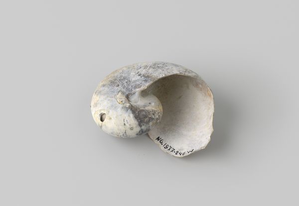 Curator: Here we have a "Turbo marmoratus" shell, recovered from the wreck of the Dutch East India ship "Witte Leeuw," which sank before 1613. Editor: Immediately, what strikes me is the contrast – a found object presented almost as baroque sculpture, this union of nature and historical drama, it seems frozen in time. Curator: It’s intriguing how the accident of its retrieval transforms the object, no? From maritime refuse into a compelling commentary on Dutch maritime history and colonial enterprise. The shell itself becomes a silent witness. Editor: Absolutely. Its muted coloration invites tactile investigation, urging one to ponder about erosion. How does it now transcend its function and become a purely aesthetic artefact? The structure is beautifully articulated, showcasing its intricate spiral. Curator: Yes, it offers a direct tangible link to an era of significant exploration and tragic loss. The wreck, as a watery grave, encapsulates the risk inherent in the VOC's pursuit of trade routes. What a material and immediate reminder that such wealth came at considerable human and environmental cost. Editor: I'm fixated on how its imperfections—the weathering, the remnants of its marine past—contribute to its narrative. The textural irregularities offer a nuanced complexity. A visual tension in the simplicity of its form against the gravity of its origins, creating a complex, multi-layered semiotic artwork. Curator: Agreed. It highlights our contemporary awareness of colonial trade, the human and natural cost to those exchanges and that makes this, arguably, more than just a pretty, wrecked object. It’s a fragment of history speaking volumes. Editor: I suppose, in its own way, that each groove, bump and scar becomes a character in the grand story this unassuming item helps retell.