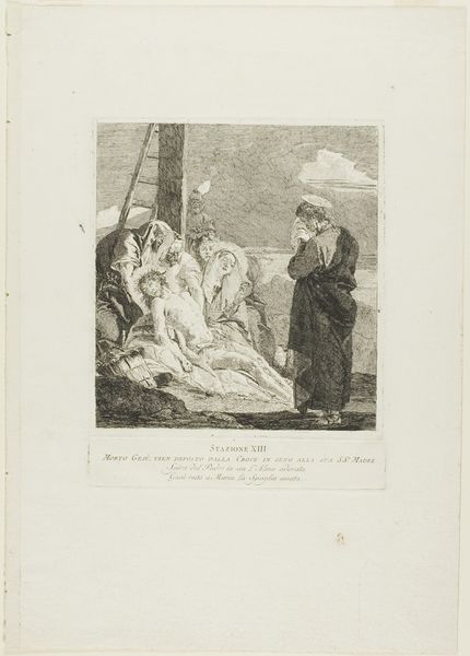 Editor: Here we have Giovanni Domenico Tiepolo's "Christ is Nailed to the Cross," plate eleven from Stations of the Cross, created around 1748-1749. It’s an etching, with strong lines, depicting a very vulnerable Christ. It's a stark image, quite affecting. What's your interpretation of this work? Curator: This print reflects the Baroque era's interest in drama and emotion, but it also tells us something about the evolving role of religious imagery within 18th-century society. The "Stations of the Cross" series wasn't just about devotional practice; it also became a powerful form of public theatre. Notice how Tiepolo uses linear composition to direct our attention – where does your eye go first, and then next? Editor: I immediately see the body of Christ. Then the crowd around him and then a ladder to the cross. Curator: Exactly. And that ladder, the looming crowd, the brutal act of nailing – these weren't just details in a religious narrative. Tiepolo consciously chose to depict those details for public viewing. The print form made the image widely available and marketable, think of the church as the consumer of this content. Tiepolo is reminding the elites in the audience of the consequences for disrupting the order of society. Is he evoking pathos, perhaps also stirring sentiments of social responsibility? Editor: So, it's both a religious statement and a political one, aimed at influencing society. Curator: Precisely! These weren't passive devotional aids, but active agents in shaping moral and political discourse. A powerful example of how art is both reflective and formative in society. Editor: It is. I came expecting religious iconography, and I'm leaving with a sense of the social and political theatre of the church! Thank you. Curator: My pleasure, indeed understanding these visual programs offer great insights in the institutions themselves!