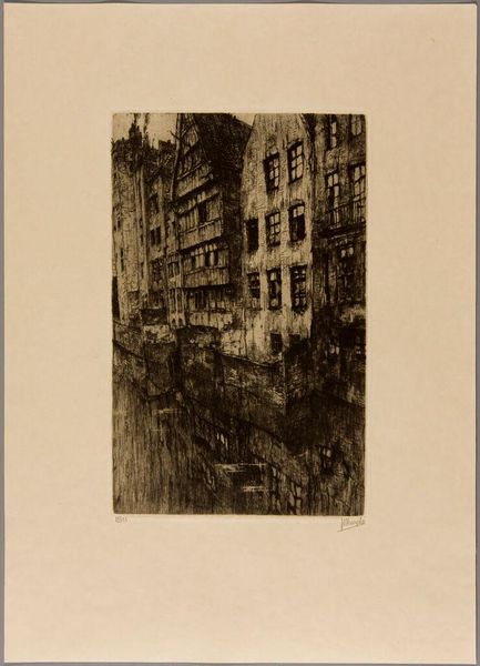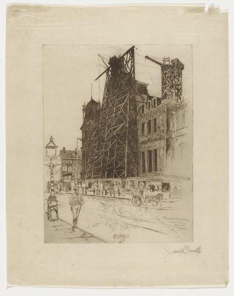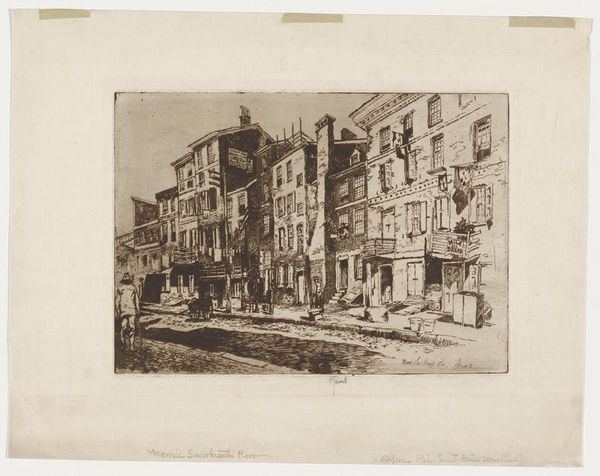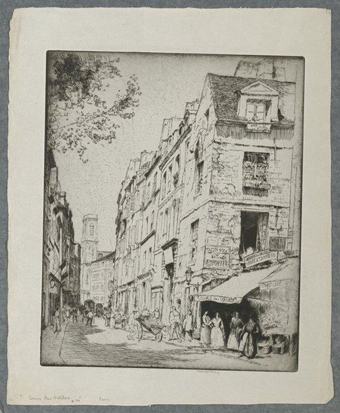 Joseph Pennell made this etching of the Mercato Vecchio using a metal plate, likely copper or zinc. The image was created by incising lines into the plate, inking it, and then pressing it onto paper, a process that allows for multiple impressions. The character of the etched line is crucial here. Notice how it varies in weight and density, giving a sense of depth and atmosphere. Pennell was a master of this medium, exploiting its potential to capture the energy of the modern city. The rapid, almost scribbled lines convey a sense of immediacy, as if the scene were captured in a fleeting moment. Think of the labor involved: the careful preparation of the plate, the precise etching, the inking and printing. This isn’t just a picture of a marketplace; it’s a record of a skilled artisan engaging with the urban landscape, transforming it through a complex, time-honored process. It’s a powerful reminder that even in an age of mass production, the hand of the maker still holds sway.