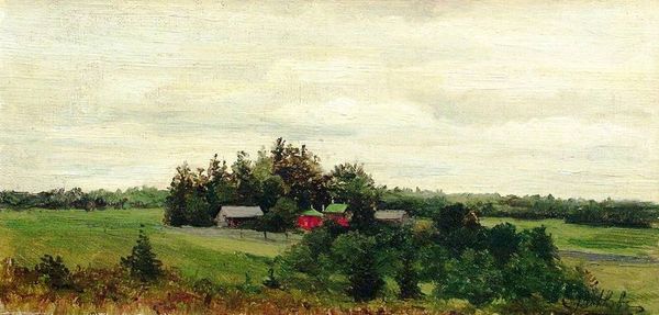 Editor: Here we have Isaac Levitan’s oil painting, “Small Village,” from 1885. What strikes me immediately is this hazy atmosphere. The colours seem muted, lending the work this sort of melancholic, peaceful tone, you know? What is your take on this, professor? Curator: Yes, it's lovely, isn’t it? To me, it sings of the vastness and quietude of the Russian countryside. Look at the composition – how the path leads your eye gently toward the cluster of homes nestled amongst the trees, each painted with such tenderness, such humanity. Levitan, as a Jew in Tsarist Russia, often found solace and a sense of belonging in these landscapes, almost as though he found refuge in this "Small Village." Do you pick up on this emotion here, too? Editor: Definitely. There’s almost a protective quality, as if the trees themselves are guarding the village. Is it just me, or do you feel a hint of isolation too? Despite the beauty, there's also a feeling of being very far away from everything. Curator: Isolation, perhaps. I think that is perceptive! I feel instead that this perspective gives us, too, an invitation to step away, to lose ourselves, to rest for a while. Consider the impressionistic brushstrokes – so unlike the rigid academic painting of the time. He really felt the wind and the sun and he shared that with us through pigment, it's an offering. And, the way light filters through the leaves! Isn't that joyous? Editor: Yes! The more I look, the more detail I see. The subtle textures, the interplay of light. Thank you so much for that, your analysis really opens up new dimensions to how I understood Levitan's style. Curator: Oh, my pleasure. Art, after all, should open hearts. And yours clearly already beats true to its wonders.