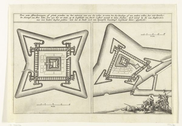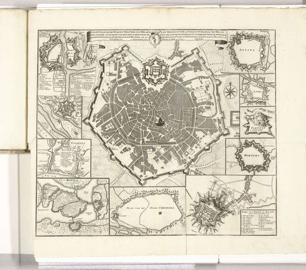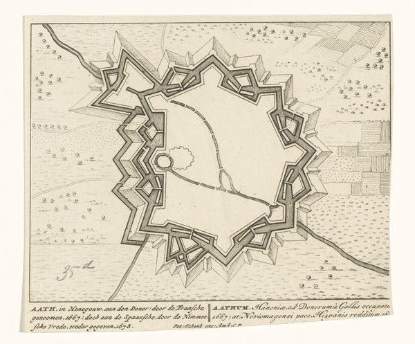 Curator: What strikes you immediately about this Baroque cityscape? The title reads "Plattegrond van Grave" – a town plan, of sorts. Editor: The precision! The etching feels incredibly laborious, a testament to meticulous craft. So many tiny, repetitive marks... you sense the human effort poured into documenting every building, every defense. Curator: Indeed. This anonymous drawing and engraving, circa 1740, uses a complex system of lines, negative space and symbolic rendering of various structures, making it feel more than a straightforward representation. Editor: Right. Beyond mere topography, it's about power, control, military might. See the strategic star-shaped fortifications along the riverbanks? That kind of architecture dictated lives, shaped the flow of commerce and community. Curator: Notice how the graphic treatment organizes a seemingly chaotic collection of buildings. The symmetry, though imposed, almost appears organic— a beautiful paradox inherent in many cities. The visual vocabulary is also quite remarkable— linear hatching indicating texture or depth Editor: You're talking about an aesthetic imposed by those with access to the materials of production. This wasn’t just a rendering, it was a carefully constructed representation serving a specific political purpose. The clean lines might have concealed the daily grind, the mud and hardship of living within those defensive walls. Curator: Of course, maps and prints held immense value—political, commercial, military. The lines represent infrastructure as well as artistic invention. We read history within the carefully controlled space. Editor: Ultimately, what grips me is the contrast between the map’s delicate lines and its implied narrative of conflict and hard work. This drawing has become a monument, not just of a place, but the countless individuals whose lives unfolded there. Curator: A beautiful paradox, I agree. Viewing the architecture within the formal construct invites endless narratives— social structures embedded within stone and line. Editor: It reminds us that every careful stroke is also a record of real, often unseen, labour, reshaping environments and marking history in lasting ways.