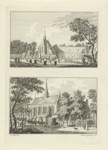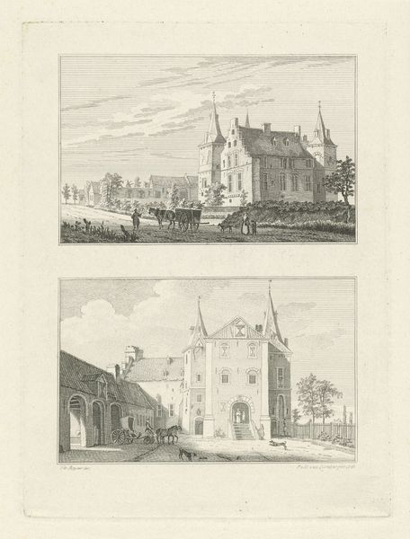 Editor: This print, "Twee gezichten op Kasteel Doorwerth, van voor en van achter gezien," made between 1745 and 1792 by Hendrik Spilman, shows two views of Doorwerth Castle rendered in etching and engraving. I'm struck by how it showcases the castle's dual nature - its imposing fortress-like presence and its position within the landscape. What stands out to you? Curator: It's fascinating to consider these prints in relation to the evolving role of castles within 18th-century society. We're seeing a shift away from castles as purely military structures. This is towards seeing them more as symbols of heritage and national identity. Think about it – why create multiple views? Who was the intended audience? Editor: Maybe to show off different architectural elements? Or cater to a growing public interested in their national monuments and landscapes? Curator: Precisely! The rise of tourism and increased interest in the past fuelled a demand for these kinds of images. Prints like these democratized access to important landmarks. Spilman’s work not only depicts the castle, but it also subtly participates in shaping public perception. We see Doorwerth framed almost like a stage set for the narratives of Dutch history. Editor: So the artwork isn’t just about depicting a castle; it’s about constructing a narrative around it and its place in society. Is that right? Curator: Exactly! The print participates in broader conversations about national pride, landscape, and the cultural significance of historical buildings. It encouraged a sense of shared identity and connection to the past amongst its viewers. Editor: I hadn't thought about the socio-political forces shaping how we even *see* something like a castle! Curator: These kinds of visual representations really mediated the public understanding and appreciation of cultural heritage, don't you agree? It goes beyond just the image, doesn't it?