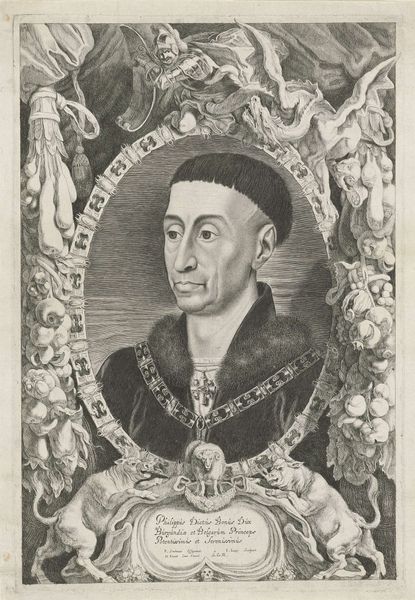 This is Frederik Bouttats' portrait of Philip the Good, rendered with etching, a technique known for its precision. The portrait’s impact arises from its study of structure, carefully arranged within a rectangular frame containing an oval. This directs our focus inward, towards the detailed representation of Philip. Observe the contrast in textures—the soft rendering of his turban against the firm lines defining his face. The intricate chain and fur collar add depth and complexity. The composition invites a semiotic reading. The oval shape symbolizes continuity and the cyclical nature of power. The gaze is directed off to the right, suggesting a forward-thinking vision. Bouttats uses line and form to not only depict but also to interpret Philip’s role and character. The contrast of light and shadow gives volume to the piece and enhances its solemnity. Ultimately, this portrait encapsulates an era, using form and structure to articulate narratives of power, legacy, and perception.