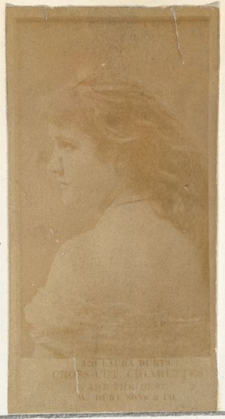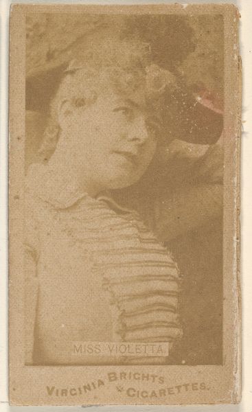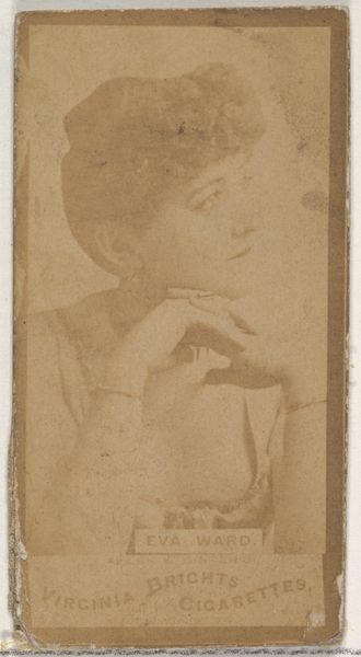 Curator: This rather faded card is part of Allen & Ginter's "Actors and Actresses" series, dating from 1885 to 1891. It was originally included in packs of Virginia Brights Cigarettes. Editor: It's such a poignant little thing. It feels ghostly, like a half-remembered photograph salvaged from a dusty attic, whispering tales of a forgotten performer and a bygone era of casual tobacco consumption. Curator: Exactly. It reflects the period's fascination with celebrity and portraiture, capturing the likeness of a performer while also acting as an advertisement. Consider how tobacco cards served as pocket-sized galleries, accessible to a broad public. Editor: Right, a gallery interwoven with capitalism and commodity culture. This object really speaks volumes about the entanglement of entertainment, identity, and marketing during this historical moment. Who was this actress, and what kinds of roles was she allowed to portray, considering her gender, within the theatrical milieu of that time? Curator: Sadly, many of the performers featured in these cards are now unknown. They've become anonymous figures within a larger cultural spectacle. Editor: And yet, even in anonymity, the pose and presentation become deeply compelling when thinking about the construction of the feminine ideal and the performer's gaze for that moment in the Gilded Age. How did she understand herself as a "public figure" being used to market an addictive product? Curator: The medium itself is evocative. It's printed on paper, with a drawing made with coloured pencil, and utilizes photography; these cards are emblems of fleeting popularity, cheaply and quickly reproduced. Yet, this particular card shows wear, carrying its own unique history of handling, and of value accrued over time. Editor: That tension between mass production and the individualized aging of an object really gets to the heart of why material culture matters. A card like this helps us think critically about fame, gendered labor, and consumerism across centuries. It shows that objects—even these tiny cards—aren’t neutral; they're mirrors reflecting the biases and values of society back at us. Curator: Yes, I find myself returning to that notion of the "pocket gallery." Editor: Well, this small window onto another world leaves me eager to learn even more.