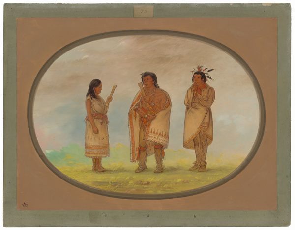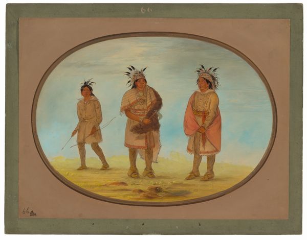 George Catlin created this oil on canvas painting, titled "Four Dogrib Indians," during a period of westward expansion in America. Catlin was deeply interested in documenting the appearance and customs of Native American tribes, but his approach was shaped by the prevailing attitudes of the time. His representations participated in the broader cultural narrative of the 19th century, often romanticizing or idealizing Native American life while simultaneously reflecting the power dynamics of colonialism. The figures in the painting are presented with a mix of cultural markers and individual characteristics, hinting at the complexities of identity and representation. To understand this work, it is essential to look at Catlin's other paintings, travel writings, and the historical context of American expansionism, which shaped his vision and artistic choices. The value of the image is contingent on understanding the social and institutional contexts of its making.