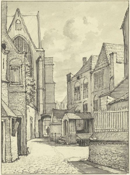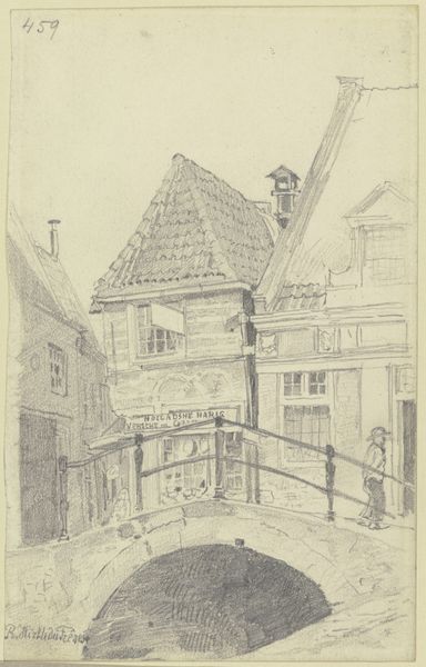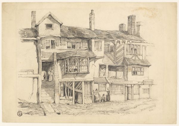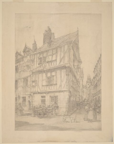 Curator: Look at this etching from 1860, "Ancienne habitation à Bourges, dite "La Maison du Musicien"" or "An Old House at Bourges, Sometimes Called the 'Musician's House'" by Charles Meryon. He’s got a real knack for architectural details, wouldn't you say? Editor: It's arresting, definitely draws you in. But what hits me first is this sense of precariousness, almost a melancholic imbalance. The buildings lean in, the light is murky... it feels like a memory fading, or a stage set about to collapse. Curator: Well, Meryon did have a turbulent life and channeled much of that into his art. He really became known for capturing a very particular Paris undergoing transformations and other urban subjects like this. He almost seems to memorialize places, like this “Old House.” There is always some historical building, or social context he includes. It seems to always hold a place in his pieces. Editor: That fragility I felt, it makes sense now knowing Meryon was etching a past disappearing before his eyes. Look how he teases detail from the grime of the printing. The lines are so delicate and almost brittle that creates an overwhelming sense of being aged and ready to come undone, not exactly collapse, more like crumble. Curator: Exactly! There’s a Romantic's nostalgia at play, and a Realist's documentation of change. He uses ink and print techniques in a such a way that really brings out the cityscape with very expressive light and darks. I always see the smoke plumes rising into the sky, as a symbol for progress barreling forward and perhaps not so subtly consuming this historic home, in this case this print embodies a powerful symbol of transition and preservation. Editor: Makes you wonder what stories that “Musician’s House” holds. Who lived there, what music filled those rooms? What did they all see? Now the old house is represented here with a musician. The scene could almost inspire some contemporary poem lamenting a lost heritage. Curator: Right! Meryon offers more than a depiction; he gives us a historical portal, a way to witness Bourges, at this pivotal moment. Editor: So well said. Meryon does invite a pause. In the end the print compels you to reflect. A wonderful blend of documentation and the dream of remembrance.