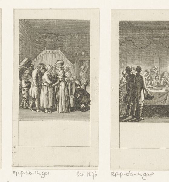Daniel Nikolaus Chodowiecki made this print, titled 'Mr. Albany bidt met zijn kinderen en dienstmeisjes naast het bed van de bewusteloze Cecilia,' using etching. This image presents a scene of domestic life in a specific cultural context. It invites us to consider the social hierarchies and religious practices of the time. Likely created in 18th-century Europe, it would have been shaped by the prevailing religious and social norms, where family prayer and the role of servants were commonplace. The visual codes within the print, such as the kneeling figures and the presence of a sickbed, convey themes of piety, familial duty, and mortality. The composition reflects a structured household, emphasizing the roles of family members and servants within that structure. To understand this artwork fully, we might explore historical texts on family life, religious customs, and social hierarchies, gaining insight into the values and beliefs that influenced its creation.