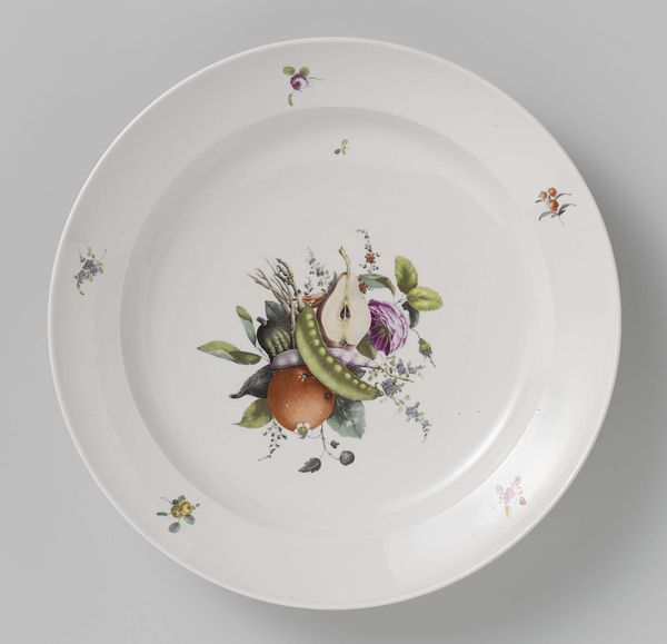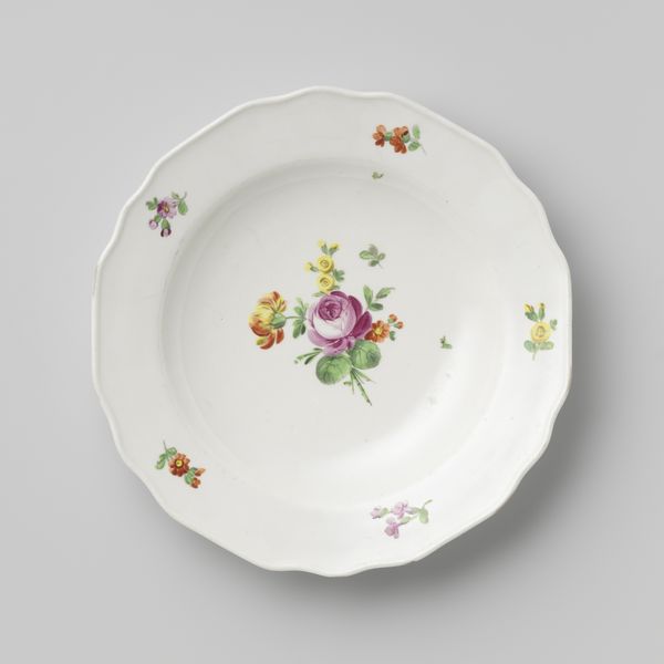Curator: This is an 18th-century "Saucer" currently held in the collection of the Minneapolis Institute of Art. Editor: My immediate reaction is how delicately the colours interact! The floral patterns create a visually pleasing rhythm around the circumference, even a sort of lighthearted joy. Curator: Right! What we are observing is a fine example of the decorative arts tradition and its reliance on folk-art motifs—an object likely created within specific workshops or familial settings where specialized skills related to painting and ceramic production were cultivated. Editor: And the material presence can’t be overlooked. Its elegant symmetry establishes a comforting sense of balance—red and blue are the predominant colours, each subtly offset by green and hints of yellow, with forms radiating from a central medallion! Curator: Yes, precisely—the Rococo influences become obvious. The social use-value of this saucer also demands our attention. Consider how everyday rituals were infused with beauty, perhaps to highlight status, or simply to elevate the domestic sphere! Editor: Looking closely, one notices how the painter deployed line, form, and space so intelligently; how each flower is positioned and angled. It speaks to a well considered structural system at play within these boundaries. Curator: Agreed. Beyond its pure visual appeal, understanding the craftsmanship involved—mixing the tempera paints, firing the ceramic at precise temperatures, reveals the collaborative, hands-on nature of artmaking during this epoch! Editor: Indeed. But ultimately the success comes down to the compositional relationships...the internal cohesion between color and space, resulting in a wholly resolved work of art! Curator: Well, in that case we’re circling back to how its origins within a tangible material reality affect its value. Editor: Quite! Thanks for sharing this moment, I leave with fresh appreciation for this charming artifact! Curator: And I'm now more mindful of how aesthetic pleasure intertwines with craft production. Thanks!