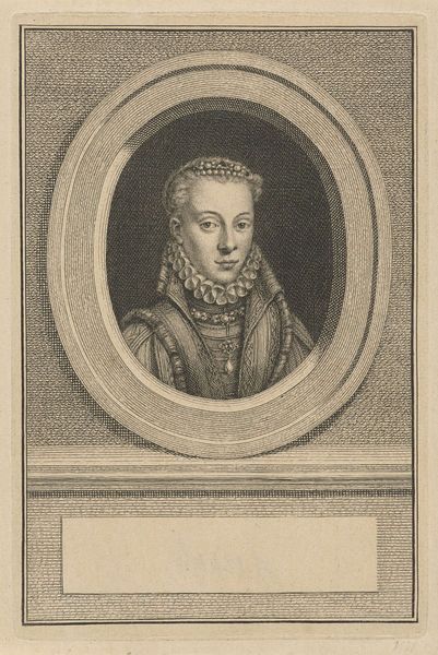 Editor: This is a portrait of Renata of Lorraine, Duchess of Bavaria, created between 1588 and 1595 by Johann Sadeler I, an engraving currently housed at the Rijksmuseum. I’m immediately struck by the textures: the intricate ruff, the layered hair…it’s so detailed. What strikes you about the visual construction of this engraving? Curator: Primarily, the artist's skilled manipulation of line. Note the variation in thickness and density that constructs the forms. Consider how these linear gradations delineate the fall of light across her face, or define the intricate folds of the ruff. It’s all about the articulation of form through calculated mark-making. Editor: I see what you mean. So the value isn’t about light and shadow in a naturalistic sense, but rather how it articulates shape and texture? Curator: Precisely. And examine the oval frame. How does this shape contain the portrait, further emphasizing the interior space of the composition versus the exterior? Does the figure interact with the edge, or is she entirely self-contained? Editor: That’s interesting. She does seem self-contained, even aloof. Her gaze meets the viewer, but the composition feels closed, focused inward by the oval frame. Curator: Notice also how the cross at her chest echoes the linear nature of the engraving technique itself. What relationship do you see between this geometric form and the curvilinear flourishes in her hairstyle? Editor: It almost creates a sense of tension. The rigidity of the cross versus the fluidity of the hair creates a captivating balance. Curator: A keen observation. These juxtapositions invite close visual examination, wouldn't you agree? Editor: Absolutely. I initially responded to the portrait on a superficial level, but by focusing on the structure, I am appreciating the artist's decisions so much more. Thank you for pointing out those compositional strategies.