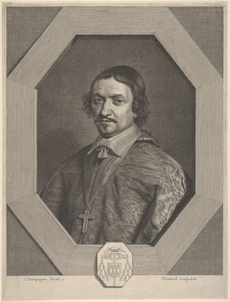 Curator: Look at this striking print by Jean Boulanger from 1664. It's titled "Portret van François Isidore de Haynin". What’s your initial take on it? Editor: The first thing that hits me is the overwhelming weight of historical and social standing. It's such a formal, rigid composition, and the subject looks so serious! I wonder about the intended audience. Curator: As a historical portrait, the intention was undoubtedly to solidify and project status. We see that Francois Isidore de Haynin was, among other things, an abbot, deeply ingrained in religious and political power. Note all the crests that act almost like a frame of ancestral identity! Editor: Precisely! The frame practically shouts his lineage and authority. All those heraldic devices… they're visual cues meant to situate him within a very specific socio-political hierarchy. It speaks to the importance of ancestry during the Baroque period. It really emphasizes how power was inherited and displayed. Curator: Indeed. And it continues a powerful language. In that sense, he almost transcends a specific likeness. The clothing, the composition – everything is meant to embody established, inherited ideas of leadership and religious sanctity. Even his pose seems calculated to evoke those notions. Editor: Do you think that it achieves that effect on contemporary viewers? Does that intended message of immutable authority hold up or does the artwork become simply another example of now obsolete propaganda? Curator: That’s precisely the core of our mission! In considering symbols over centuries, the intention certainly remains readable, though perhaps through a somewhat more cynical lens for us. Editor: Exactly. For today's museum visitor, removed from the specific context, this image prompts broader questions about the representation of power, tradition, and perhaps even their illusionary nature. Curator: Yes, precisely. That intersection – what an image meant versus what it evokes today – is such rich territory. Editor: I agree. Images always evolve to reflect shifting social conditions and become, inevitably, entangled in our present experience.