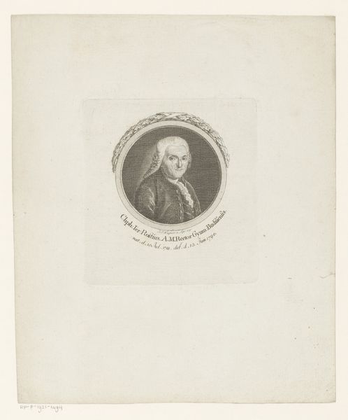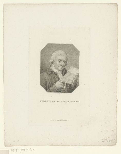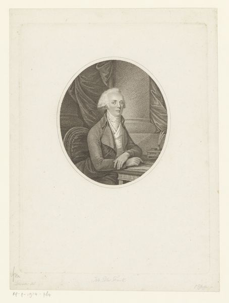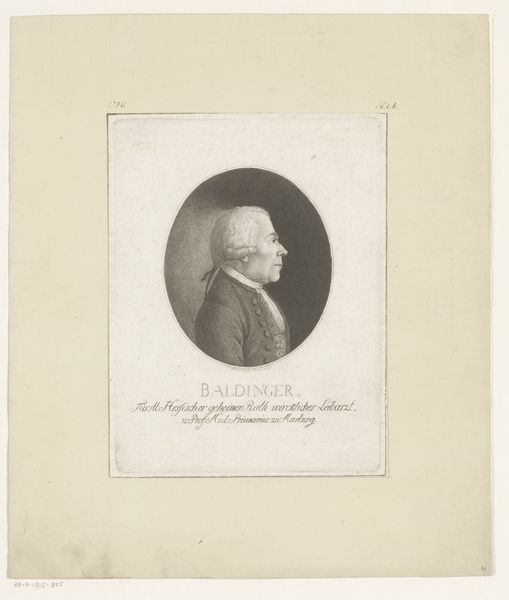 Curator: This engraving, created between 1779 and 1829, is entitled "Portret van Johannes von Müller." It's a striking example of neoclassical portraiture, attributed to Carl Hermann Pfeiffer. The print on paper uses light pencil work and features a subject who appears to be caught deep in thought. Editor: Yes, there is such stillness! I feel like I’m peering into the mind of a very serious thinker. The aged paper gives it this wonderfully faded quality. It's like the past is breathing down my neck! And the detail is exquisite. It’s like seeing someone’s soul rendered in light and shadow. Curator: The backdrop certainly lends itself to this effect. This style, popular at the time, places Müller within a space referencing antiquity, enhancing his image as a scholar. Also note the tiny scene behind him, of Greek Gods, I believe. The composition places him squarely in a tradition of learning. It elevates the sitter, suggesting a timeless quality. Editor: Oh, I missed that tableau behind him! But the oval format also feels intimate somehow. Like peering into a locket. This intimacy softens the academic austerity. It really is an inviting composition, so peaceful and meditative. Curator: The use of monochrome contributes to the formal, intellectual feel that was fashionable in academic portraits. Figures like Müller were portrayed in a manner meant to convey intellect, sobriety and dedication to scholarship and writing, attributes valued in that time period. Editor: And what I like is that something in his expression undermines it all a bit. A slight furrow of the brow, something about the downturn of his mouth that is almost mischievous. I keep wanting to know his secrets! Or maybe his worries. Curator: Portraits like this served to cement reputations and shape public perceptions of historical figures. It places him firmly within a lineage of European thinkers and intellectuals. Editor: Ultimately, I am captivated. These kinds of historical figures always offer us such unique lenses through which to look at our own world. Curator: Absolutely. Art provides this fascinating glimpse into how individuals and society as a whole viewed themselves.